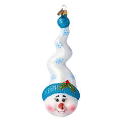 This delightful snowman ornament is full of festive charm, featuring a glossy copper-colored twisted hat adorned with glittering peppermint candies and green sugar dots. His smiling face, rosy cheeks, and carrot nose radiate warmth, while the fluffy white trim and holly accent add a cozy Christmas touch. A playful and joyful addition to any holiday collection.