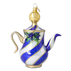 Icy Pine Tea Pot features cool turquoise and white stripes highlighted with soft gold accents and a delicate pine motif. A fresh, winter-inspired glass ornament with a calm and elegant character.