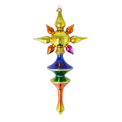 A vibrant red and gold star with contrasting jewel-toned spikes, evoking festive energy and handcrafted brilliance.